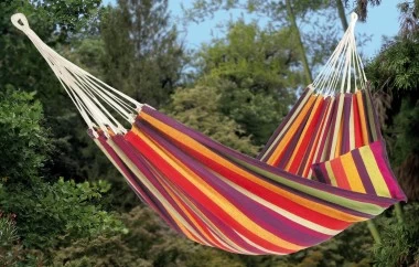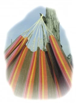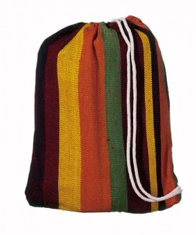 Gewebte, buntgestreifte Hängematte aus Baumwolle mit einer ausreichend großen Liegefläche. Im Tragebeutel. Die Hängematte für Garten oder Campingplatz.