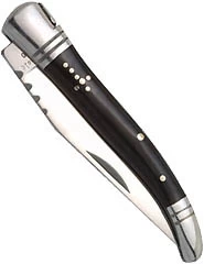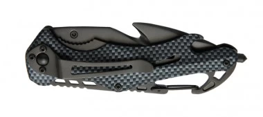 Das Rettungsmesser Emergency hat eine halbseitig gezahnte Klinge aus 420er Edelstahl mit Titanbeschichtung. Für Notsituationen bietet das Messer 3 Funktionen: einen Gurt-, Seilschneider, einen Scheibenzertrümmerer sowie einen Flaschenöffner. Die Sicherheitssperre ‚Liner Lock‘ erlaubt das Öffnen und Schliessen mit nur einer Hand. Eine Gürtelschnalle sowie ein integrierter Karabinerhaken runden die Ausstattung ab.