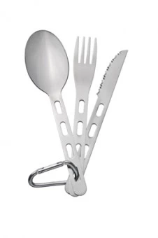 Robustes Besteckset mit scharfem Sägemesser, Gabel und Löffel für den Einsatz in der freien Wildbahn. Das Set wird mit praktischem Neoprenbeutel und Karabiner geliefert. Aus Edelstahl gefertigt ist es sehr langlebig.