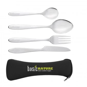 Das sehr leichte Besteckset von Basic Nature besteht aus vier Teilen: Gabel, Messer, Ess- und Teelöffel. Diese lassen sich im leicht zu reinigenden Neoprenbeutel bequem transportieren. Das Besteck ist aus hochwertigen Edelstahl gefertigt und besitzt eine hohe Ergonomie.