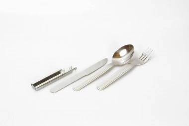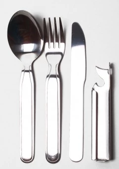 Einfaches Edelstahlbesteck. In der Funktion dem Bundeswehrbesteck nachempfunden.