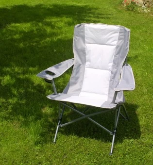 Sehr bequemer Faltstuhl mit gut gepolstertem Sitz und hoher Lehne. Ideal für Urlaub und Freizeit. Mit Getränkehalter in der Armlehne und stabilem, pulverbeschichtetem Stahlgestell sowie dem obligatorischen Packsack.