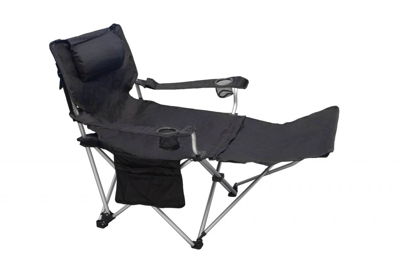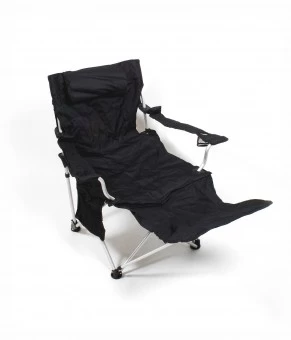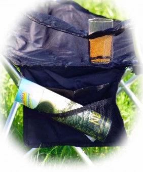 Das Highlight unserer Travelchair-Reihe: Dieser Sessel (so kann man ihn schon nennen) verfügt über Armlehnen mit eingebauten Getränkehaltern, eine bequeme, verstellbare Rückenlehne mit separatem Nackenkissen und eine angebaute Fußstütze (abnehmbar). Seitlich ist ein Steckfach für Lektüre und Kleinkram angebracht. So bequem sitzt man sonst nur in der heimischen Sitzgruppe. Stabiles und sauber verarbeitetes Alugestell mit 600D Polyester Bezug. Natürlich mit Tragetasche.