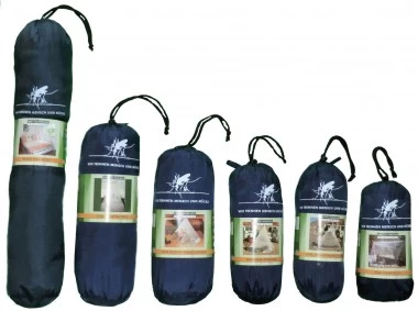Baldachinförmiges Netz aus feinstem und besonders leichtem Polyamid. Liegt auf dem Bett auf. Sehr kleines Packmaß. Rundum geschlossen.