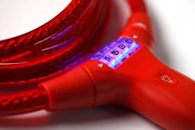 Ein Schloss mit einem stabilen 12 mm Stahlkabel und einer Ummantelung aus Vinyl (zum Schutz vor Kratzern durch das Schloss) zur Sicherung Ihrer Ausrüstung draußen vor dem Haus, in der Wildnis oder am Campingplatz. Die zurücksetzbare, 4-stellige Kombination kann auf eine von 10.000 Möglichkeiten eingestellt werden. Der Zahlencode kann für ein Öffnen im Dunkeln mit einer LED beleuchtet werden.