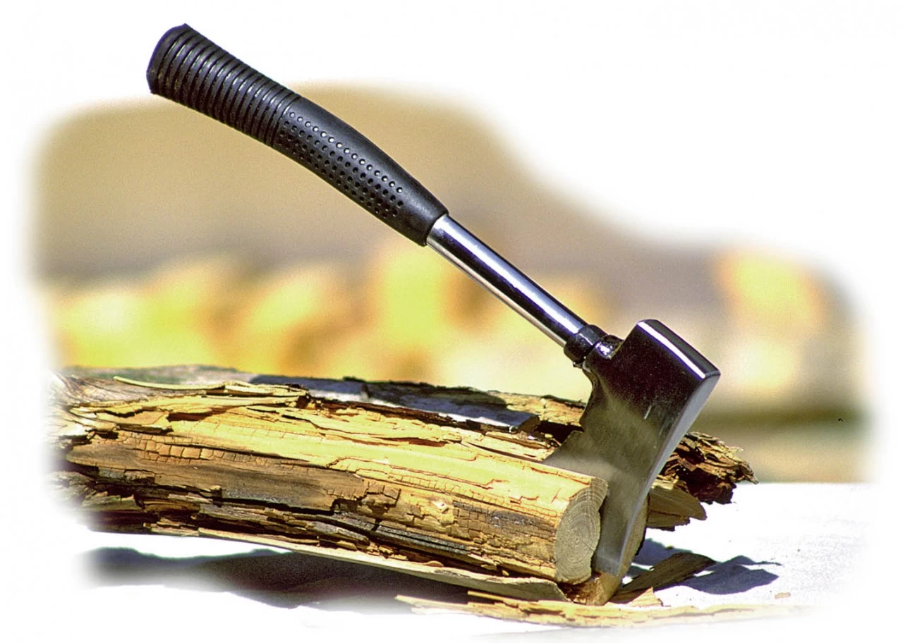 Gehärteter Axtkopf, Stahlschaft, rutschsicherer Griff. Nicht für größere Holzarbeit im Profisinn gedacht. Aber für’s Brennholz reicht es allemal.