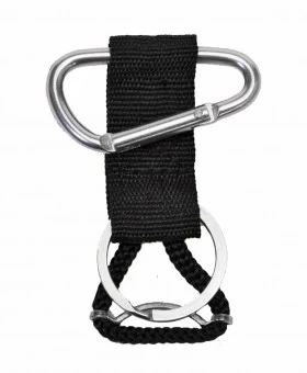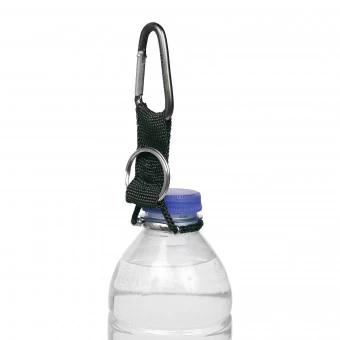 Kleiner Karabiner (50 mm lang) mit Flaschenhalter. Kunststoffring zum Anklippsen an den Flaschenhals. Passt an Flaschen mit 2,5 cm Halsdurchmesser. Einfach, aber effizient. So machen Sie Ihre PET-Wasserflasche einfach am Rucksack oder Gepäck fest.