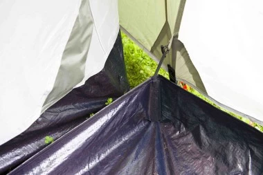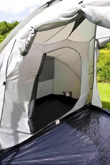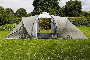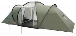 Großes komfortables Kuppelzelt mit 2 separaten Schlafkabinen und dazwischenliegendem Wohnbereich. Das Zelt hat 2 Eingänge, 2 Ventilationsklappen, 2 Innentaschen sowie einen Kabelschlitz.