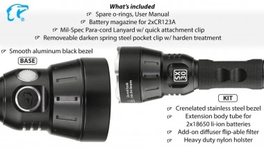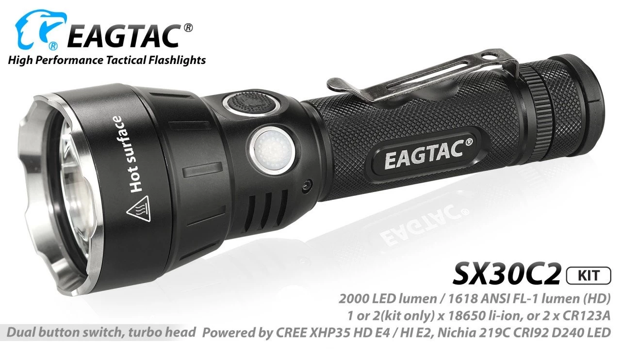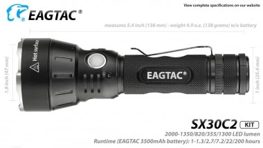 EAGTAC SX30C2 Kit ist eine überarbeitete S200C2. Bei der SX30 geht es JETZT aber um Reichweite. Diese wird durch den relativ großen Reflektor in Verbindung mit der Cree XHP35 HD ermöglicht. Es werden Rechweiten von über 550m nach ANSI Standard ermöglicht und das mit einer immer noch kompakten Taschenlampe.