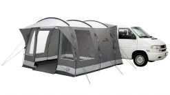 Ein freistehendes Vorzelt in Tunnelbauweise für Wohnmobile, MPV und Busse. Wird mit zwei vorgebogenen Gestängebögen aufgebaut und durch zwei Stahlstangen im Inneren stabilisiert. Das Zelt hat wegen der großen Fensterflächen eine gute Aussicht zu bieten und ist hell und geräumig. Die Fenster sind mit Vorhängen ausgestattet. Der Boden ist wannenförmig hochgezogen um Schutz vor Feuchtigkeit und Insekten zu bieten. An der Rückseite ist eine Doggingzone, welche ein bequemes Rangieren des Autos an das Zelt ermöglicht. Das Verbindungsteil zwischen Auto und Zelt wird dann einfach über das Auto gezogen und befestigt. Optional ist ein kleines Innenzelt (# 154108) erhältlich, welches schnell und einfach eingehängt wird und 2 Personen Platz bietet.