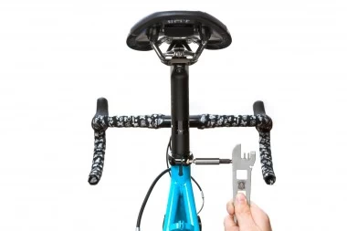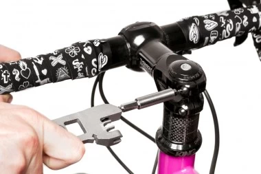 Das kompakte Multi-Tool aus rostfreiem gehärtetem Stahl ist der ideale Begleiter für die Reise mit dem Fahrrad. Ausgestattet mit Kettennieter, Speichenschlüssel, verschiedenen Bits und wechselbaren Edelstahlstift. Ein magnetischer Bit Einsatz/Bit-Halter ist mit eingearbeitet, so dass das Werkzeug als Schraubendreher verwendet werden kann. Inklusive Ledertasche, mit Befestigung für das Fahrrad.