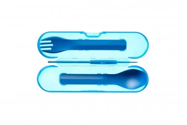 Reisebesteck in neuer Form und Art: die kompakte Transportdose bietet geöffnet Zugriff auf jedes einzelne der Teile und schützt das Set hygienisch. Beinhaltet sind im Trio je eine Gabel mit vernünftigen Spitzen und einer Teil-Kante (für weichere Lebensmittel), ein Löffel mit sehr weichen und mundgerechten Kanten sowie ein Messer mit gewellter Klinge. Dadurch wird eine gute Schneidleistung erreicht, die auch für zarteres Fleisch vollkommen ausreichend ist. Integriert im Messer ist ein Kapselheber. Als Zugabe ist im Set auch ein Zahnstocher zu finden. Leicht zu reinigen und leicht zu tragen.