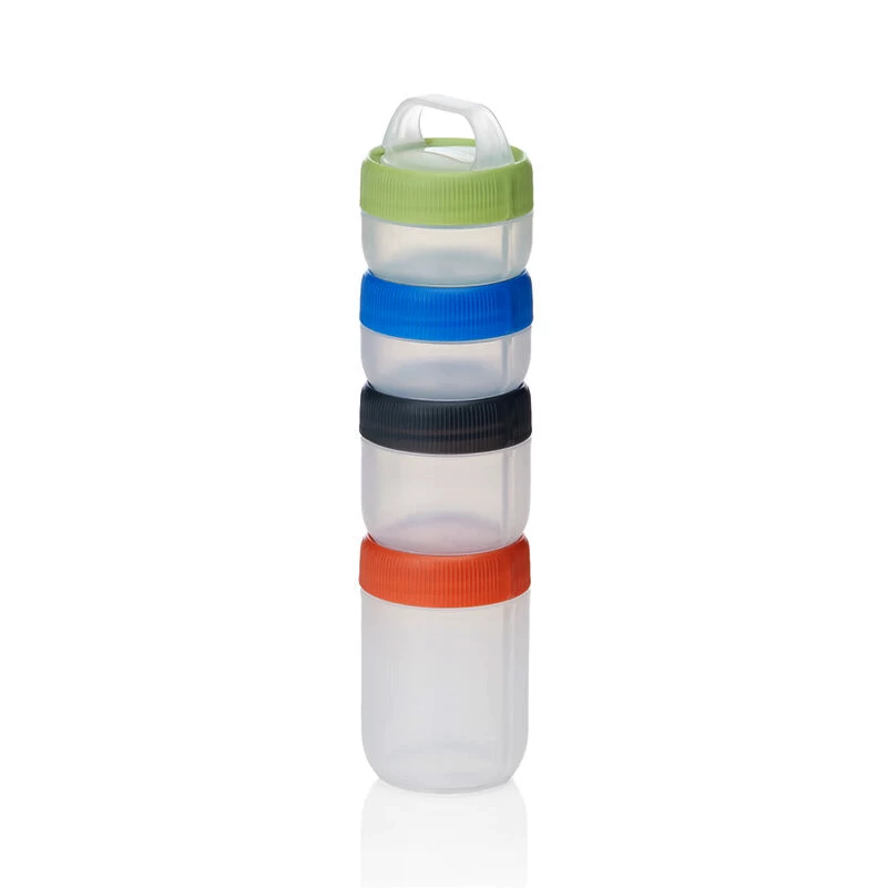 Modulares auslaufsicheres Aufbewahrungssystem mit einfachem Öffnen und Schließen durch 180-Grad-Drehung. Die Behälter sind spülmaschinenfest, mikrowellengeeignet und leicht zu reinigen. Ausgestattet mit einem Clipgriff, der zum Beispiel an einem Rucksack befestigt werden kann.