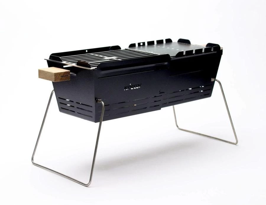 Der Knister Grill Original lässt sich auf die doppelte Größe auseinanderziehen. Dazu einfach den Grill auf den Boden stellen, Henkel nach oben klappen, leicht auseinanderziehen und die Roste wieder hineinlegen.