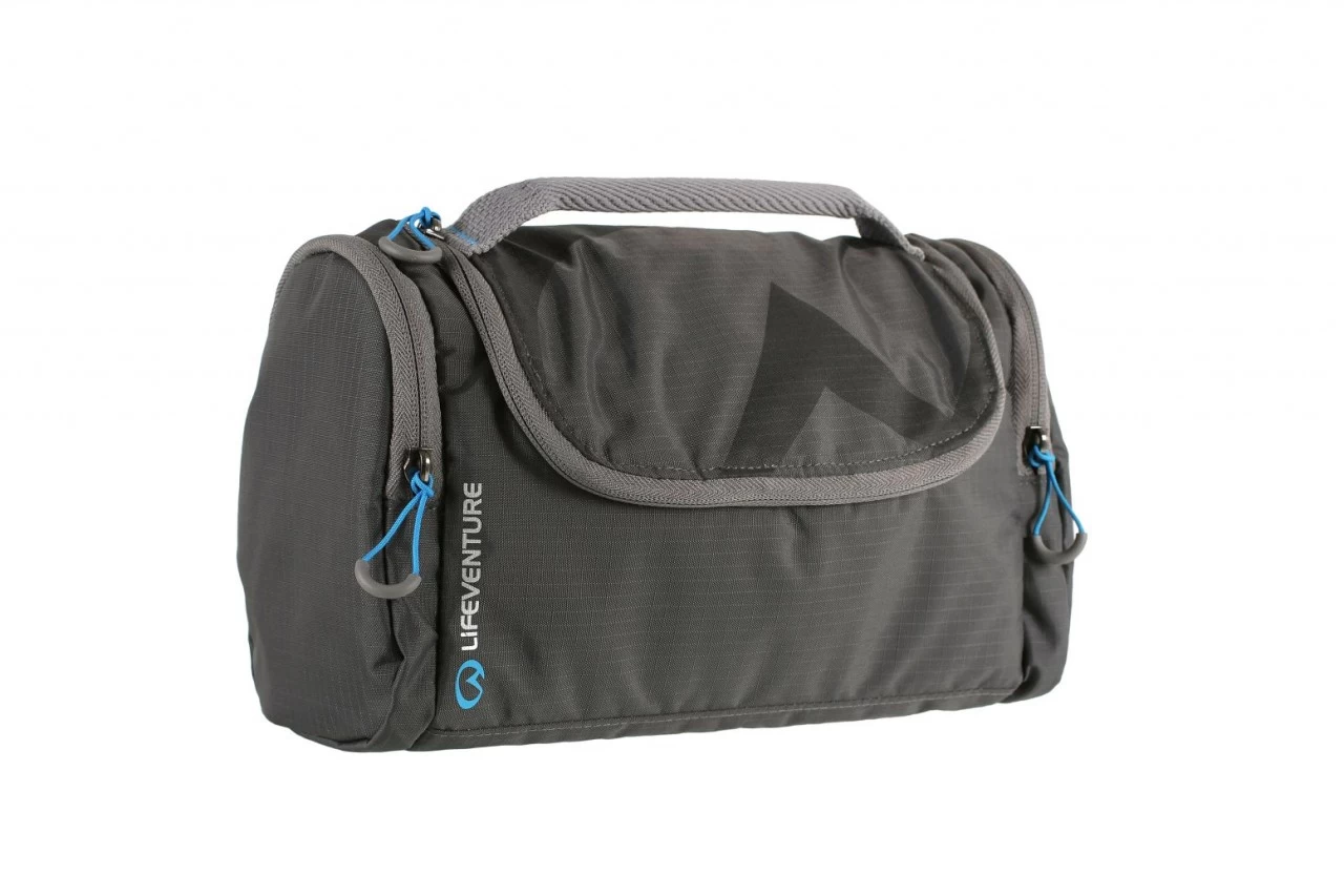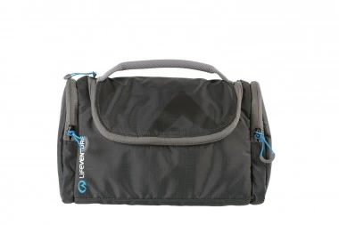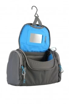 Die Waschtasche verfügt über ein Hauptfach, zwei Außentaschen, einen abnehmbaren Spiegel, mit Hacken zum Aufhängen und eine Innentasche mit Reißverschluss.
