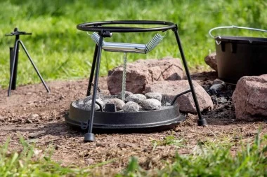 Der Deckelhalter ‚pro-ft‘ greift den Deckel samt darauf liegenden Briketts und lässt ihn erst wieder los, wenn es gewünscht ist. So wird der massive Gussdeckel leichter zu handhaben und das Essen kann indes umgerührt, gewürzt und abgeschmeckt werden ohne dass Schmutz auf die Deckelinnenseite gelangt. Der dreibeinige Deckelhalter dient zudem als Servierstand für den Petromax Feuertopf.Der Deckelhalter ft ist optimal für die Feuertöpfe ft6 bis ft12 geeignet und kann zusammengeklappt in einem Petromax Feuertopf ft6 transportiert werden. Mit den weiteren Produkten aus der pro-ft Serie kombiniert fungiert der Deckelhalter u.a. auch als Grillstelle, Räucherstand oder Kochstelle, indem der Gussdeckel des Feuertopfes umgedreht als Pfanne genutzt wird.