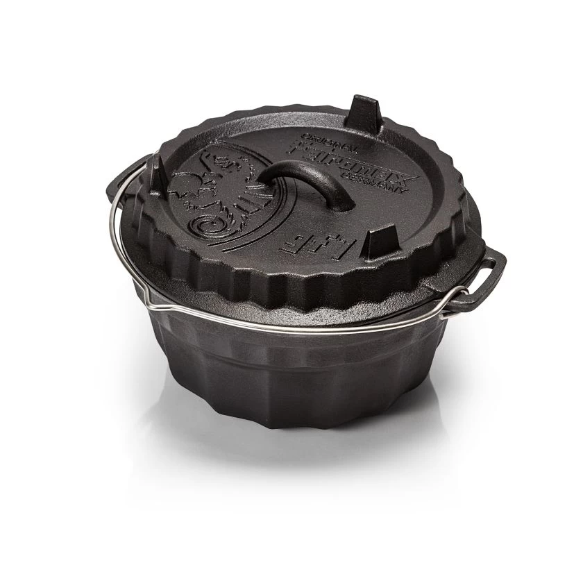 Die aus Gusseisen gefertigte Form zum Backen von Gugelhupfkuchen (Ø23 cm) und Tortenboden (Ø22 cm) im Deckel ist sowohl für den Backofen als auch für das offene Feuer geeignet. Der multifunktionale Gardeckel besitzt eine Tortenbodenform auf der Innenseite und Füße zum Aufstellen auf der Außenseite. Eine einfache Handhabung wird durch einen Tragehenkel gewährleistet.