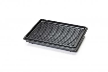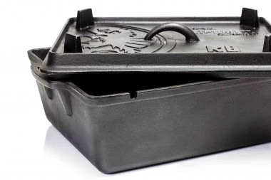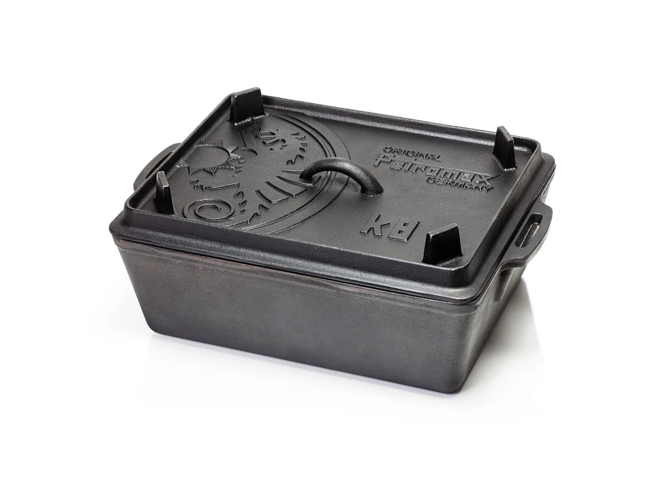 Ideal als Bräter, Auflaufform oder zum Brot- und Kuchenbacken. Mit dem Deckelheber (optional erhältlich, #402404) lässt sich der Deckel einfach und gefahrlos abnehmen. Der Deckel des ‚k8‘ besitzt ein Rillenprofil, wodurch er als Steak- und Grillpfanne gut geeignet ist.
