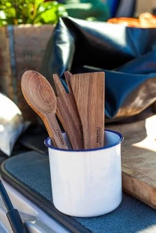 Das ‚Mise en Place‘ für unterwegs. Alles wohl sortiert und an einem Ort. Ein Zubehör-Set aus Baumwollmischgewebe mit allem, was Sie brauchen, um ein wundervolles Essen unter freiem Himmel zuzubereiten. Das Set hat eine Tasche für weiteres Zubehör und lässt sich einfach ausrollen oder aufhängen. Wenn Sie mit dem Kochen fertig sind, können Sie die verwendeten Utensilien einfach einstecken, alles zusammenrollen und mit nach Hause nehmen. Besteht aus 5 Teilen (plus Tasche): Lagerfeuer-Messer (12 cm) aus biegsamen Edelstahl, Pfannenwender, Kochlöffel und -gabel aus robustem Eichenholz sowie einer scharfen Mikro-Reibe aus Edelstahl.