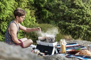 Kochset aus robustem 18/8-Edelstahl. Für jahrelangen, harten Einsatz ausgelegt. Das Set besteht aus zwei Töpfen (1,0 und 1,8 L), zwei Deckeln mit integriertem Abtropfsieb und einer Bratpfanne. Die Bratpfanne verfügt über einen Klappgriff sowie über eine Bodenplatte aus Aluminium für eine gleichmäßige Wärmeverteilung. Die stapelbaren Töpfe und die Bratpfanne lassen sich platzsparend in der mitgelieferten Tasche verstauen.