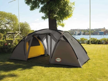 Primus ‚Bifrost H4‘ und ‚H6‘ sind große Zelte mit Schlafplätzen für 4 bzw. 6 Personen und Stehhöhe für Erwachsene. Zwischen den beiden Schlafinnenzelten befindet sich ein großzügiger Wohnbereich. Ventilationsöffnungen und Mückennetz sorgen für gute Belüftung. Das Aluminiumgestänge sorgt für hohe Stabilität, die Farbkodierung der Stangen vereinfacht das Aufstellen. Geeignet für viele Einsatzbereiche wie Camping, Paddeln, Segeln oder auch im Garten. Das Zelt ist mit Sturmleinen ausgestattet und verfügt über blickdichte Fenster und einen Boden, der einfach zwischen den beiden Schlafbereichen eingeknöpft wird. Zudem sind die Zelte mit Aufstellstangen ausgestattet, so dass der Eingangsbereich als Regenschutz oder als Schattenspender dienen kann.