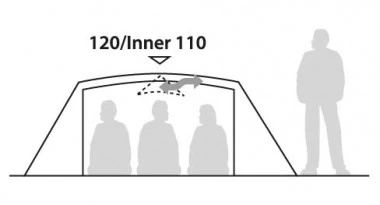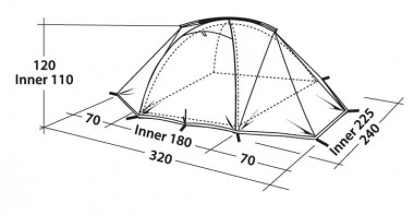 Die Kombination aus Kuppelzelt und kurzer Querfirststange ermöglicht hier eine tragbare Lodge zum flexiblen Wohnen, Kochen und Verstauen mit hervorragender Höhe und Breite. So können die Bewohner sogar bequem nebeneinander im Zelt sitzen. Die beiden Öffnungen gestatten einen leichten Zugang für die Camper bei jeder Witterung und bewirken eine sehr gute Belüftung. Das Innenzelt wird hier zuerst aufgebaut.