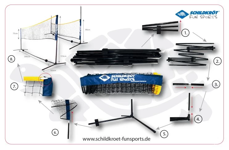 Artikel: freistehendes Netz, keine Fixierung im Boden nötig daher auch idealer Indoor-Gebrauch. Das Netz ist höhenverstellbar von 0,75m bis 1,55m, Breite 3,00m, inkl. Anleitung, in robuster Tragetasche mit Tragegurt. Technische Daten: