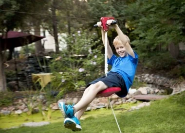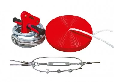 Hochwertige 30 m lange Seilrutsche aus verzinktem Stahlseil. Inklusive einer robusten Befestigungs- und Spannvorrichtung zwischen zwei Bäumen, einem Handschlitten aus pulverbeschichtetem Metall mit 2 Seilrollen, einem verstellbaren Tellersitz und weichen, rutschfesten Gummi-Griffen.